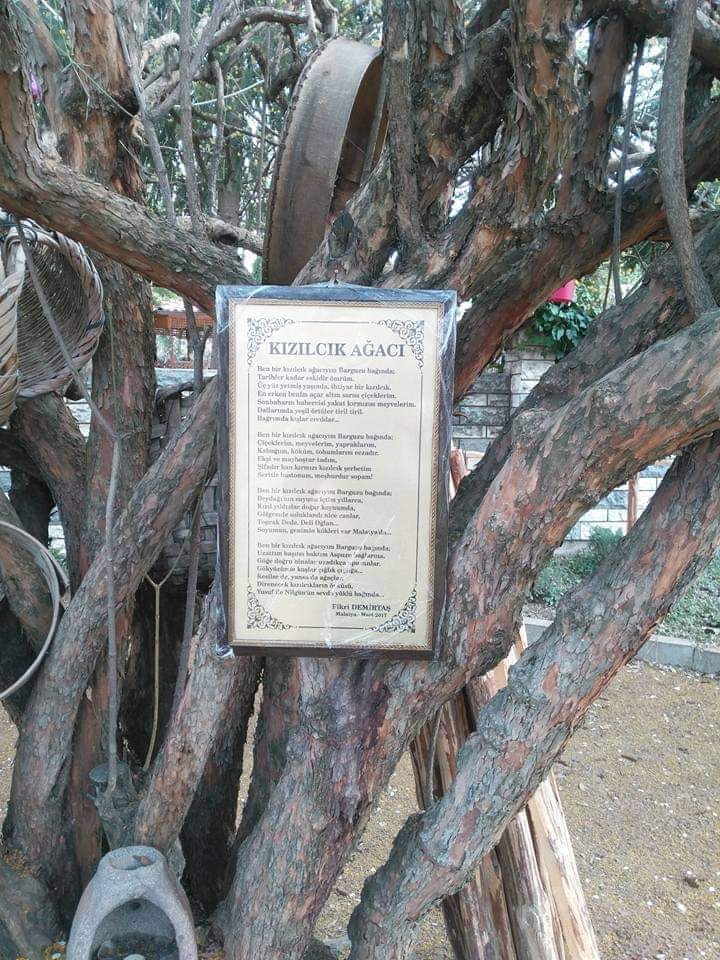 Şarkılarımıza, türkülerimize, şiirlerimize konu olmuştur kızılcık ağacı. Bu anıt Kızılcık ağacına yazdığım şiiri Yusuf Kendirli çerçeveletip ağaca asmıştır.